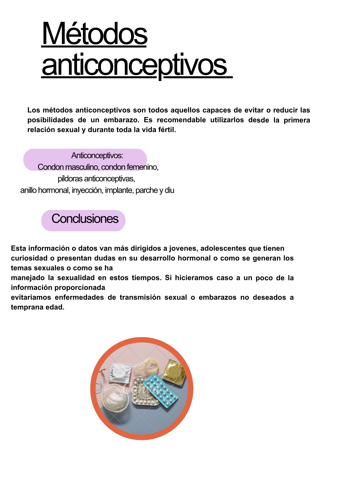 Hablaré o tratare de dar a conocer los métodos anticonceptivos, los riesgos y como el prevenir enfermedades o embarazos no deseados conociendo estos métodos con consecuencias